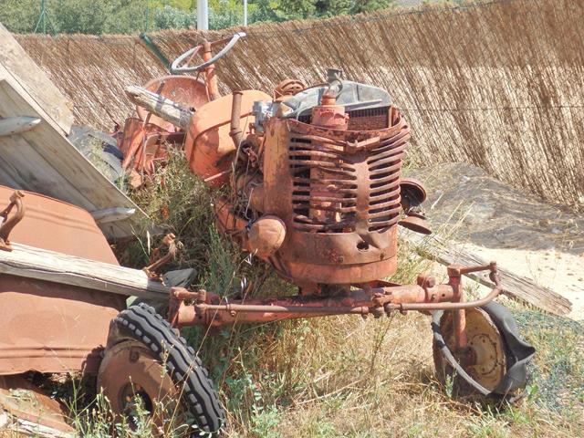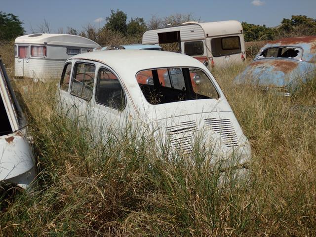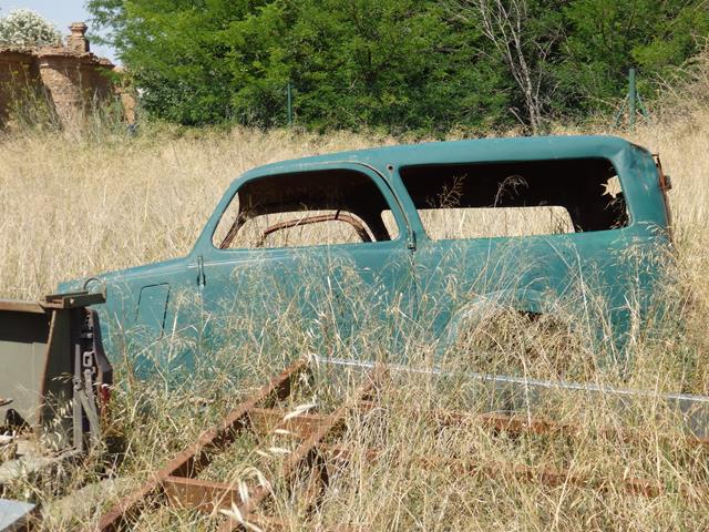 Y entre la maleza de hierbajos secos lo que es prácticamente sólo un esqueleto de color turquesa. Por la forma parece un Fiat Topolino o un Simca 5. Está tan incompleto que es difícil de adivinar qué es.