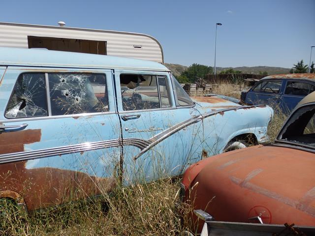Otro vehículo que está deshaciéndose poco a poco, está estacionado junto al Mercedes. Es un Ford Country Sedan, del año 1954, el concepto es el de caravana completa, muy típico de los USA en esa época, o lo que aquí se llamó más tarde «ranchera» o actualmente los modelos avant. Me llama la atención que alguien parece haberse divertido pegando tiros a este coche, pues una ventanilla presenta varios impactos de bala.