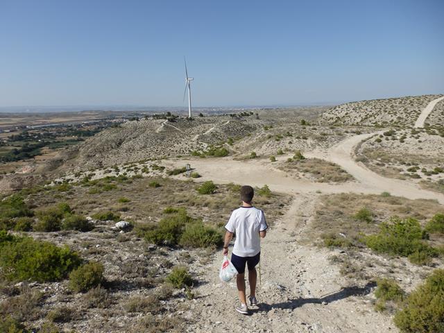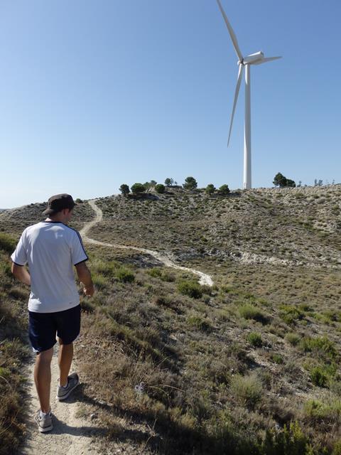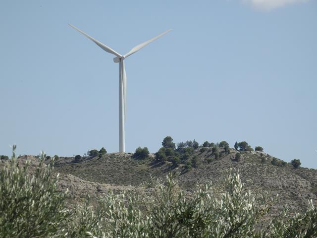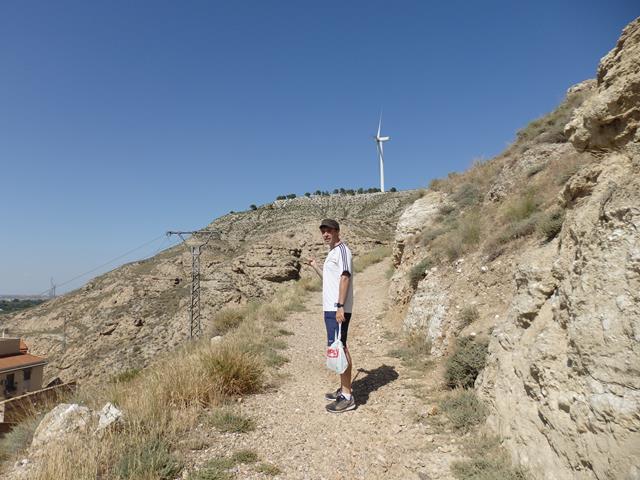 A los 18,5 km de recorrido llegamos ya al enorme molino eólico. Las aspas son gigantescas, es una obra de ingeniería impresionante. En su base somos diminutos. Aquí hay algunos árboles, pinos en su mayoría, pero no sirven para dar sombra en condiciones, pues su porte es insuficiente. Este aerogenerador está situado en el llamado Cerro de la Atalaya. Se inauguró en junio de 2008. Tiene una potencia de 1300Kw, el máximo legalmente permitido. Este aerogenerador es enorme, dos veces y media el tamaño del castillo de Cadrete.
