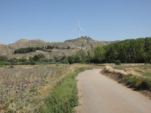 Cuando salimos de la zona de las urbanizaciones enlazamos con un camino rural para llegar hasta allí. En el horizonte vemos el enorme aerogenerador al que también queremos subir. Es un molino eólico aislado, pero es muy grande. Antes visitaremos Cadrete y su castillo.