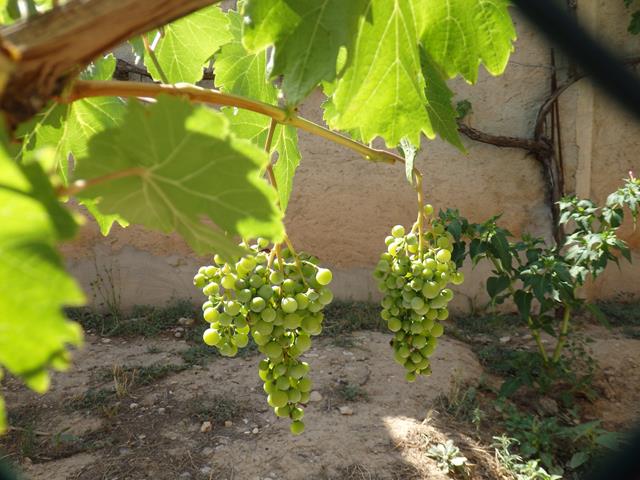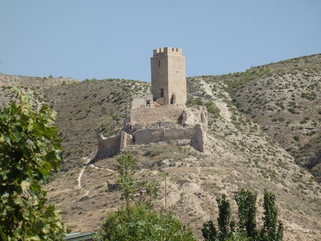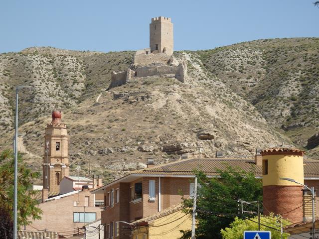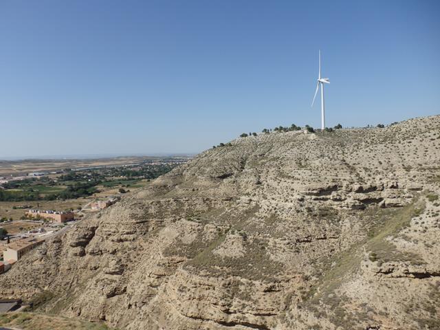 Ahora ya vemos más cerca el aerogenerador, y una perspectiva diferente del castillo. El paisaje es duro, ni un solo árbol donde cobijarse del calor. Semidesértico, estepario, un horno.