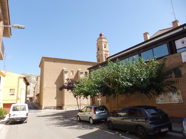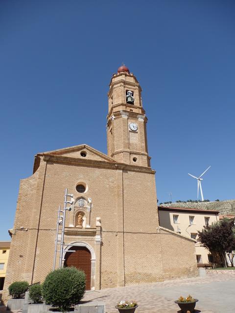 Justo antes de tomar la senda que nos llevará hasta el castillo, podemos ver la iglesia de Cadrete. Al fondo de la imagen se aprecia el aerogenerador, hasta allí también tenemos intención de subir.