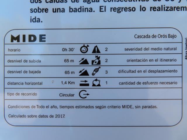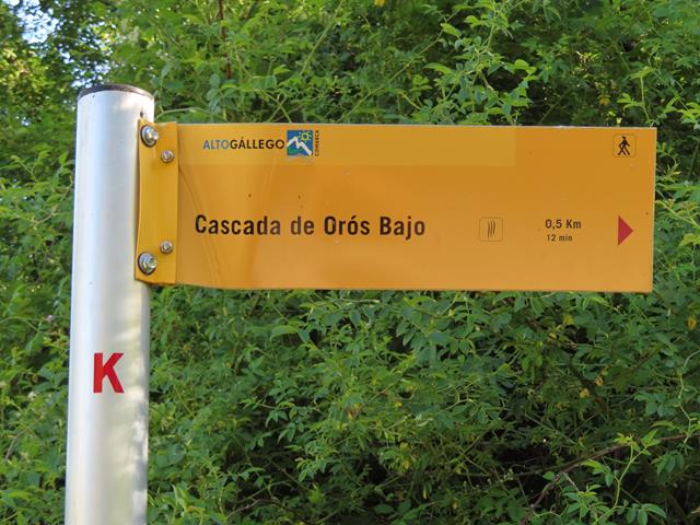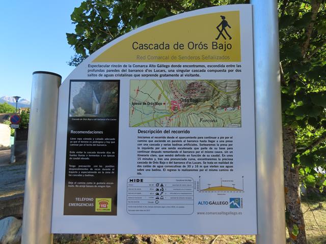 Comenzamos. Me pongo las botas de montaña, pues vengo conduciendo desde Zaragoza con otro calzado y me dispongo a emprender la marcha hacia la cascada. No hay nadie por aquí. Mejor. Lo primero que veo es el panel explicativo. Leo alguna indicación e inicio la marcha. Esta cascada está muy cerca, a 1,4 Km ida y vuelta. Me va a llevar poco tiempo llegar hasta allí. El desnivel es de apenas 65m.