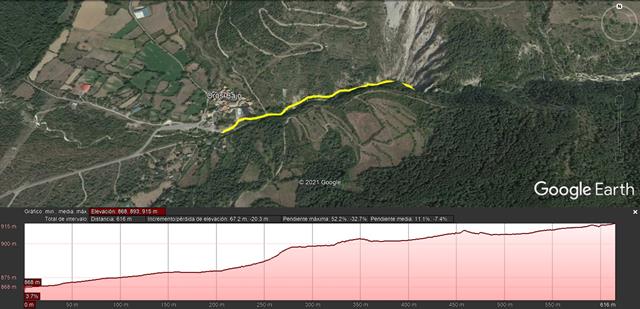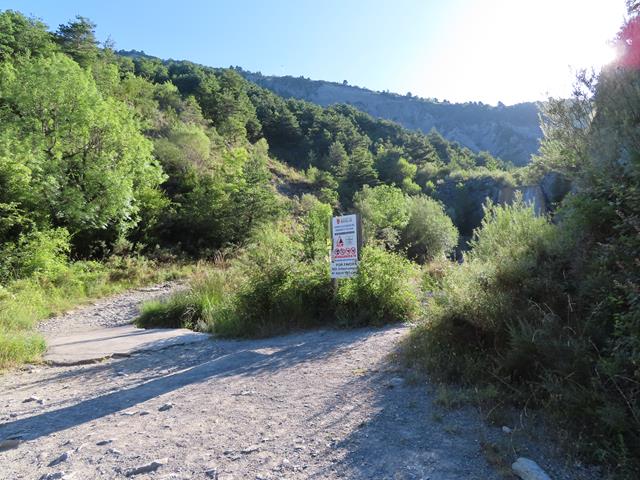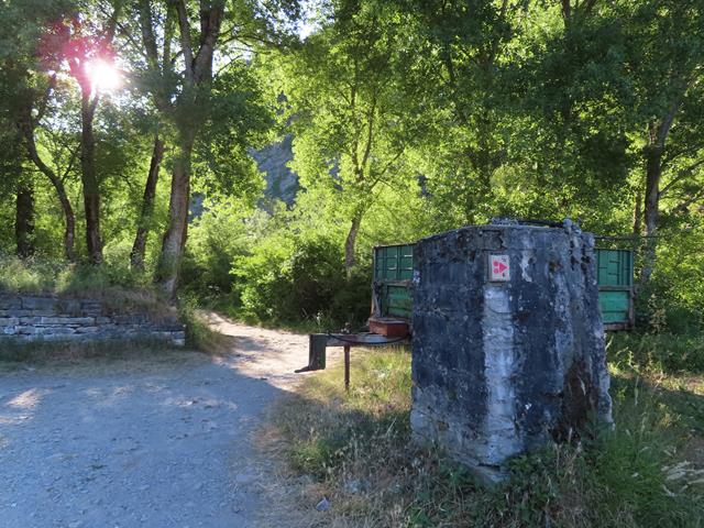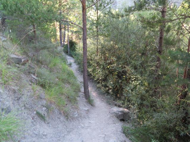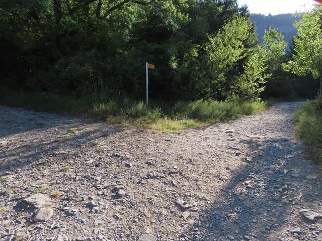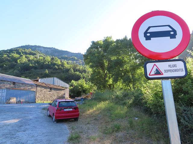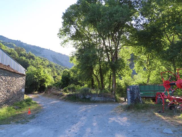 Se toma una pequeña parte de pista que discurre junto a unas construcciones del pueblo y se sigue hacia la derecha dejando a un lado una pilastra y a la izquierda una marca del GR-16. Luego llegas a una bifurcación. Hay que seguir hacia la derecha también. De todas formas no hay pérdida. Un poste con un cartel te lo indica.