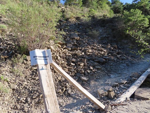 Seguimos caminando dejando un cartel a la derecha que pide que no se interrumpa el cauce del agua de riego y pasamos por un letrero que dejamos a la izquierda donde se advierte de la posible caída de piedras y desprendimientos varios. Yo no veo caer ninguna piedra, ni pequeña siquiera en todo el recorrido ni en el tiempo que estuve en la cascada. Supongo que habrá que tener precaución los días posteriores a tormentas o lluvias fuertes, que el suelo estará más suelto. De lo contrario, sin problema.