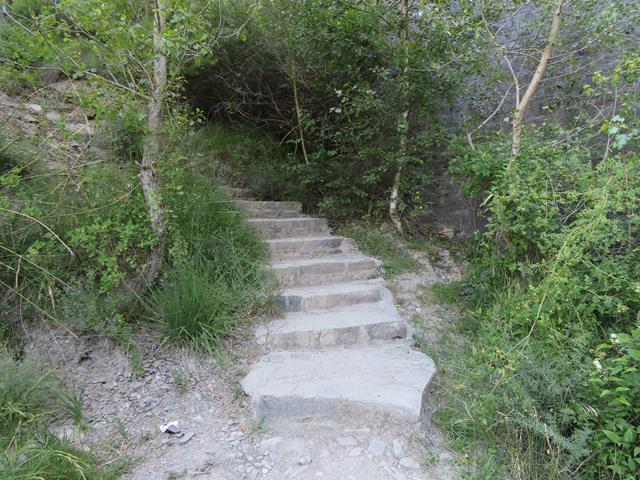 Posteriormente se llega a una presa que se va dejando a la derecha del camino. A la izquierda hay unas escaleras de hormigón que sirven para sortear la presa y seguir la senda. El camino es aceptable, aunque por momentos se vuelve más y más salvaje. Llega un punto en el que hay que caminar al lado del cauce. No necesito mojarme las suelas de las botas salvo en algún pequeño tramo, pero la mayor parte del recorrido se hace por terreno seco.