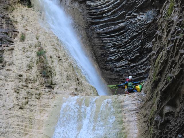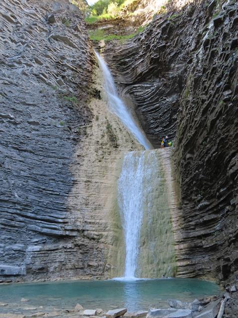 En esto que oigo voces. ¿De dónde vendrán? Aquí no hay nadie. ¡Qué raro!. Sin darle mayor importancia sigo con lo mío hasta que de pronto veo a alguien que con traje de neopreno y casco desciende por la cascada superior.