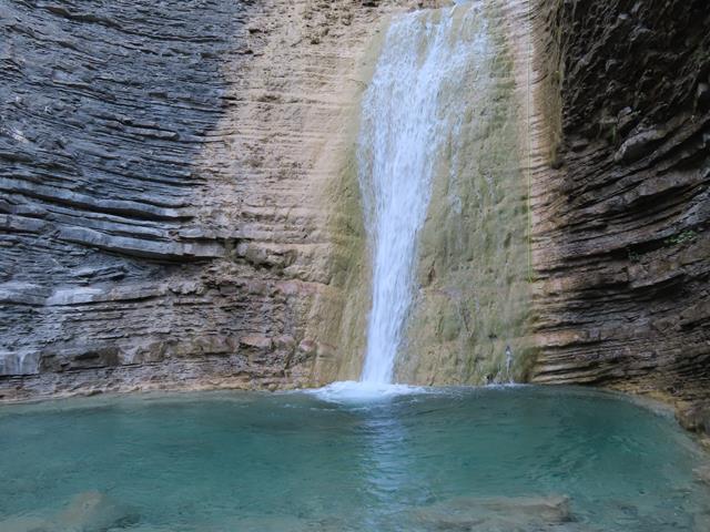 Tras un rato caminando se ve que el barranco hace curva. No se ve nada tras la curva, pero yo subo por unas losas de piedra, ganando altura y…¡oh! la cascada. ¡Qué chulada! y no hay nadie. Habrán pasado unos 20 minutos desde que dejé el coche. Más fácil imposible. Así que bajo un poco y llego hasta una poza donde el agua cae desde la altura. El lugar es muy chulo. Parece de película. En un lugar escondido e ignoto.