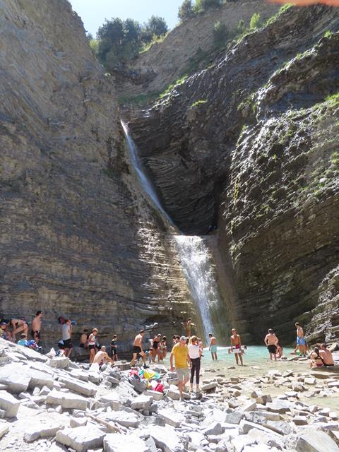 He querido añadir estas fotos de una visita que hice a la misma cascada dos años después, pero a otra hora, pasado el mediodía. Os las pongo para que sepáis que si hace buen día y en pleno verano, esta cascada y su poza parecen una piscina. Una auténtica locura para los que gustamos de disfrutar de la montaña tranquilamente. Yo simplemente, aluciné. Me esperaba gente, pero no esto.