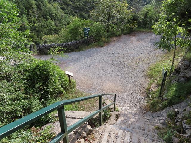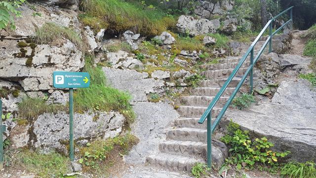 Una vez que llegamos a la zona del aparcamiento oficial, justo al lado, hay una señal de prohibido estacionar junto con otras explicativas. De ahí parte un sendero que desciende montaña abajo y en su primer tramo está protegido por unas barandillas metálicas. Hay que ir por ahí.