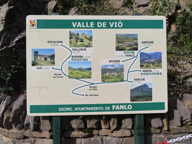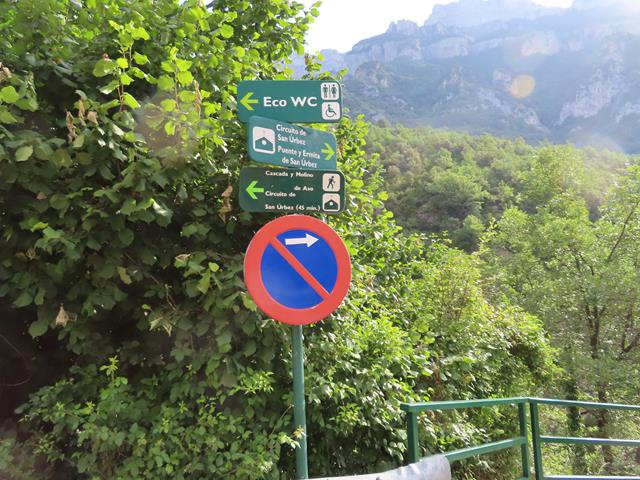 Enseguida otro poste con señales aparece a nuestra derecha, te marca las direcciones para ir al pueblo de Vió y Buerba, a Sercué y Nerín, a Bestué y los Sestrales…pero la que a nosotros nos interesa es la que pone San Úrbez de Añisclo. La pista continúa siendo muy ancha y está protegida por un murete de piedra para que nadie se pueda caer al abismo.