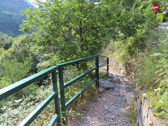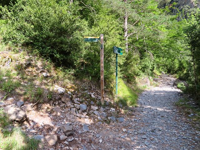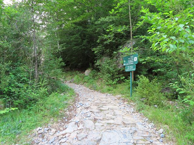 Pasado el pequeño trozo de camino que cruza el canchal, y un poco más adelante, me encuentro con un desvío a la izquierda que está bien indicado. Y aquí es donde dejo el GR.15.Es la ruta para acceder al pueblo deshabitado de Sercué y a Fanlo por el Paso del Portiello. Se aprecia como sube el sendero por la ladera del monte. Yo seguiré recto, hacia Cumaz. No hay pérdida posible.