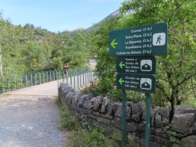 Una vez allí, ya podemos ver una serie de señales que nos indican el lugar hacia el que debemos dirigirnos según hagamos una excursión u otra y los tiempos que tardaremos en llegar. Se cruza por el puente nuevo, apto para vehículos.