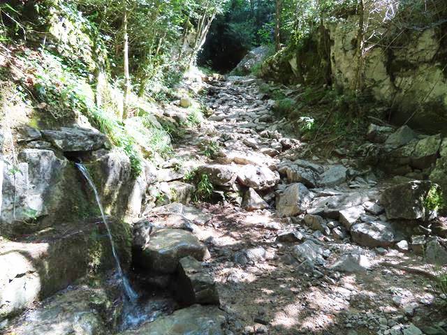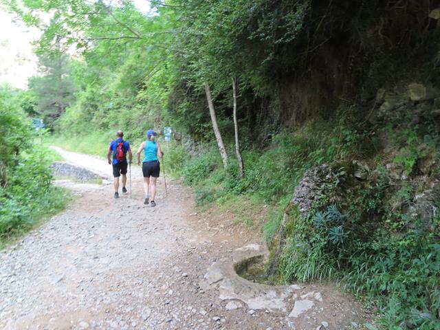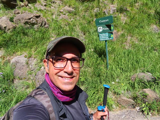 Al poco rato, llego a otra fuente, la de Cumaz. Hago lo mismo. Me refresco la cabeza y mojo la gorra, es como si fuera aire acondicionado instantáneo. Viene bien, pues el esfuerzo de ir subiendo y la humedad persistente te hacen sudar. En cuanto al firme del camino, ya lo veis, sigue pedregoso y algo incómodo de recorrer.