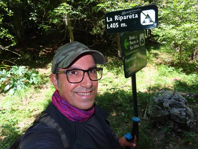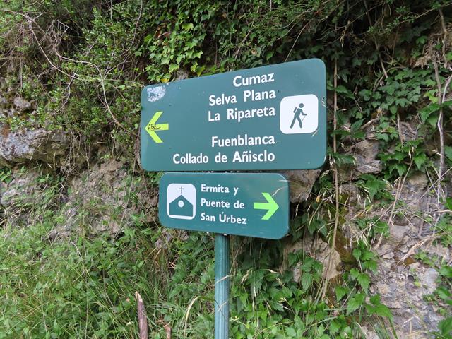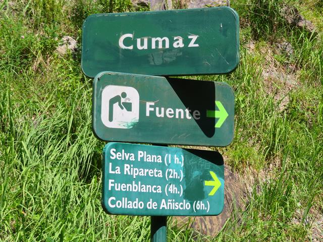 Continuamos caminando y nos encontramos con una fuente a mano derecha. Es la fuente de San Úrbez. Enseguida, a nuestra izquierda, un poste con señales varias nos indica por donde hay que ir para hacer el circuito de San Úrbez, señalando un sendero que baja hacia el río. Este circuito lo hice la otra vez que estuve por aquí, así que en la otra entrada lo tenéis todo. En esta ocasión, como mi objetivo es la Ripareta, previo paso por Cumaz y la Selva Plana, debo seguir todo recto por la pista.