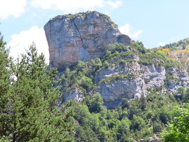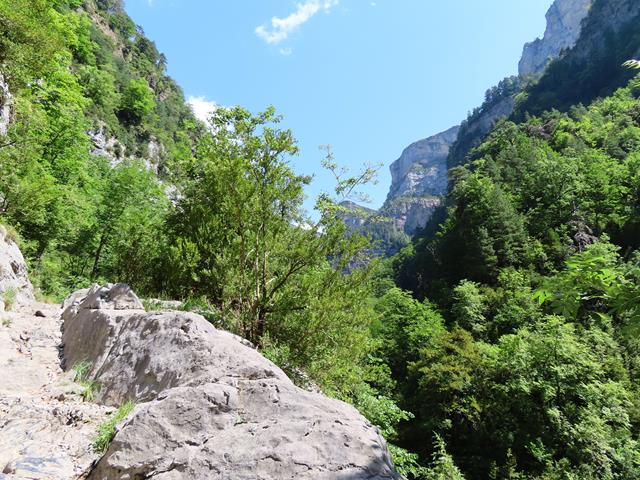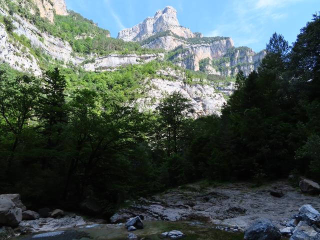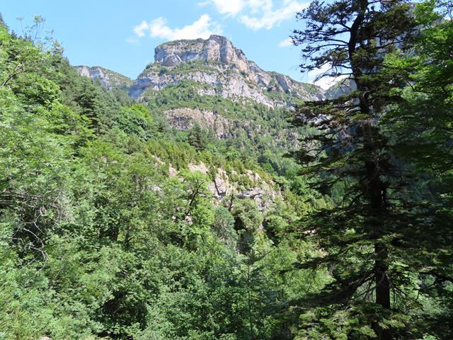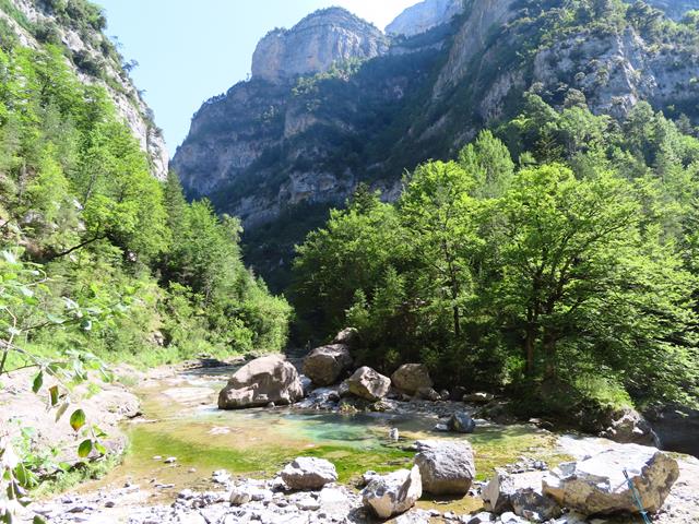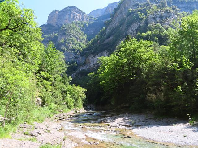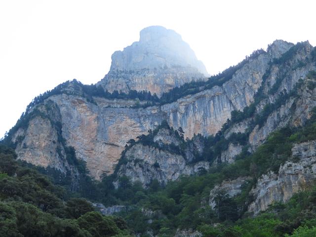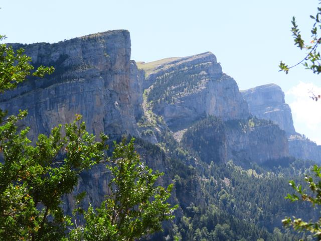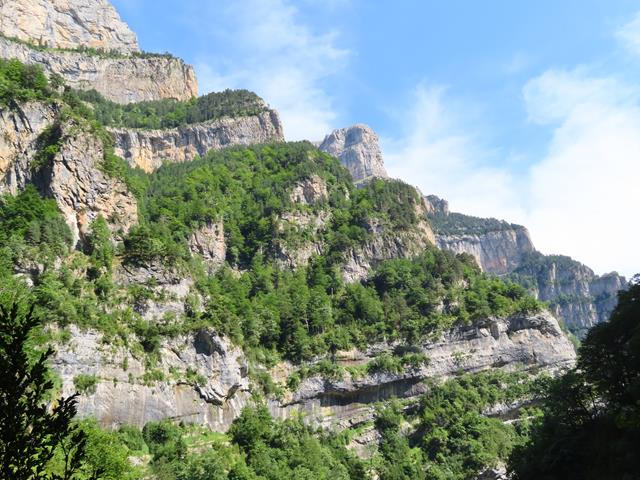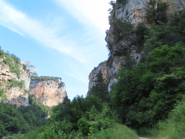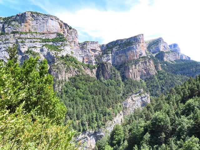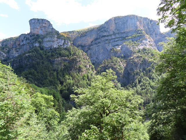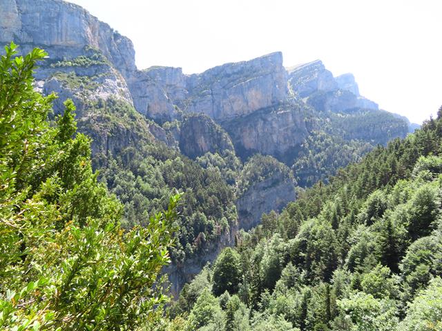 Desde aquí, mirando hacia el valle de Añisclo, ya podemos ver algunos riscos en la pared de enfrente. El perfil es en forma de V ahora, por la incisión en las calizas que ha ido haciendo el río durante miles de años, muy diferente se verá más adelante, cuando el valle vaya mostrando un perfil en U, típico de la erosión glaciar.