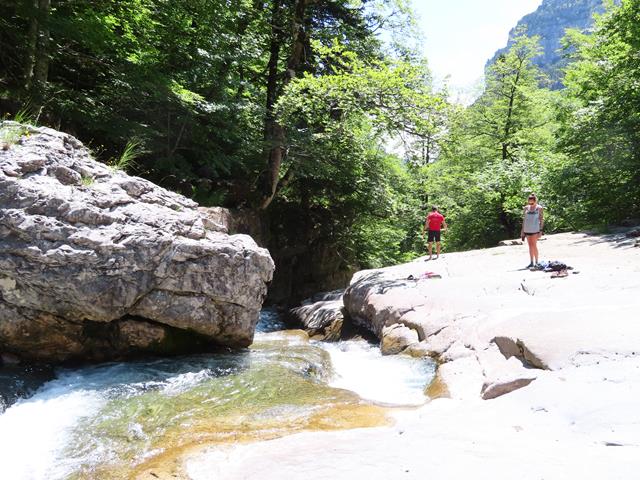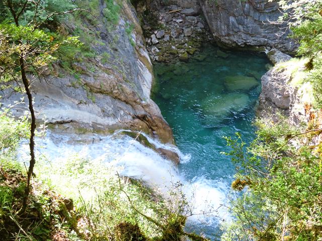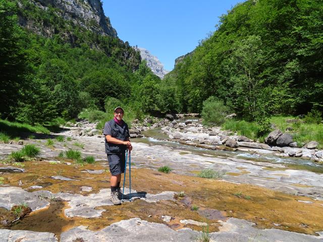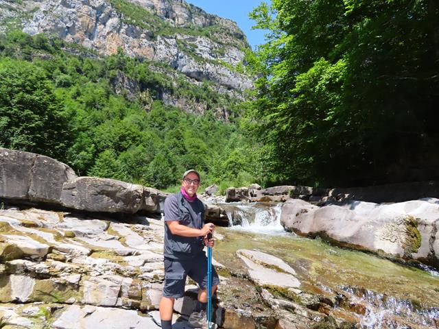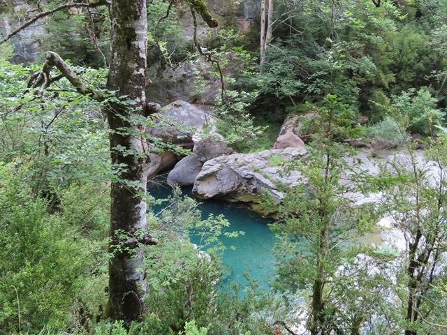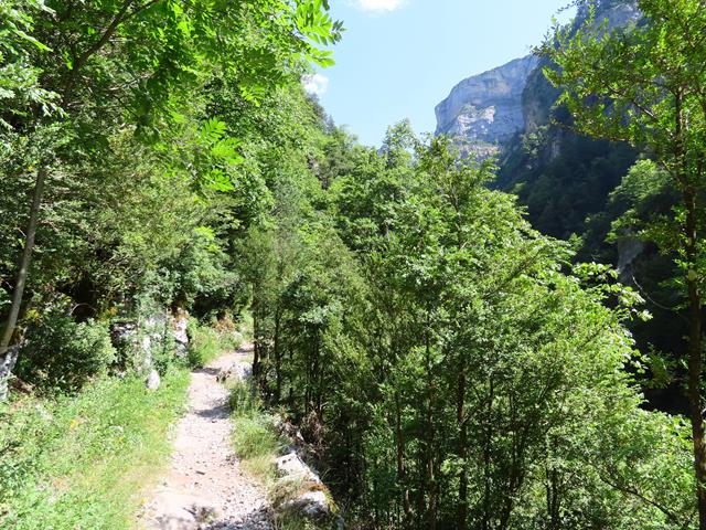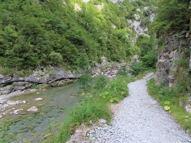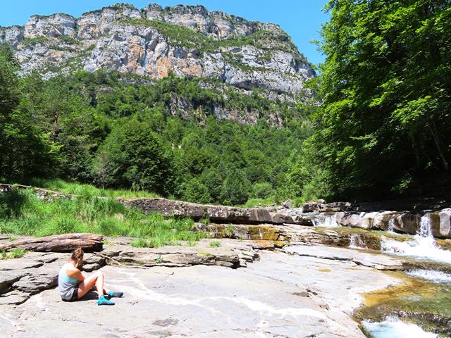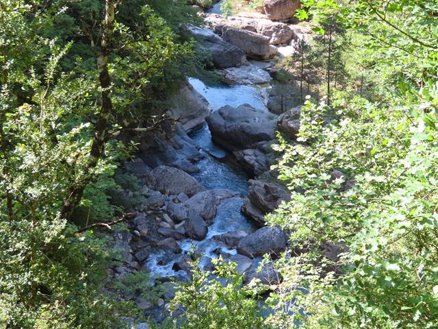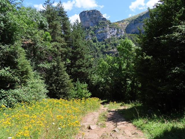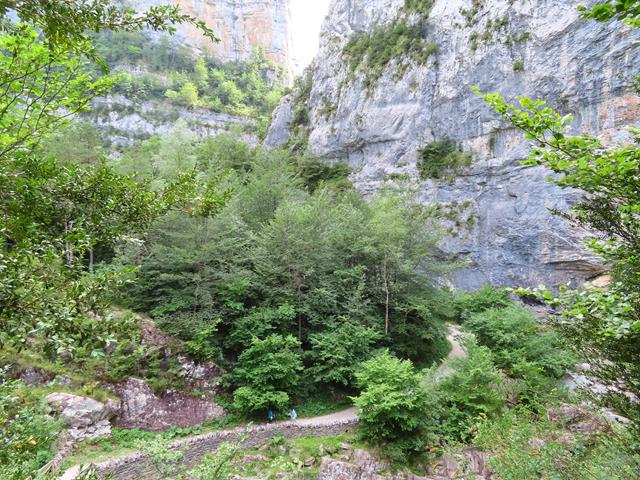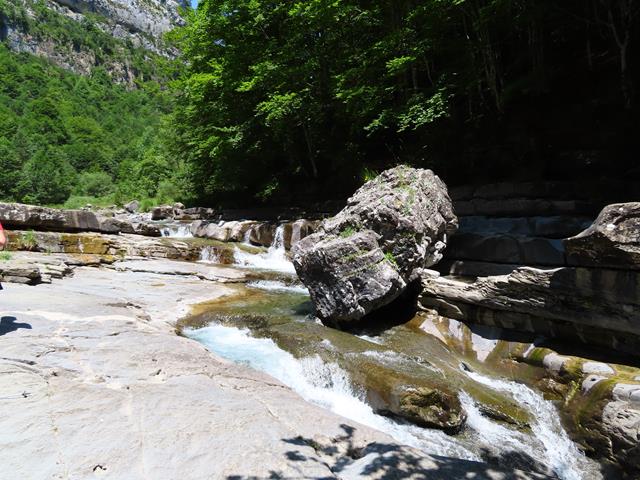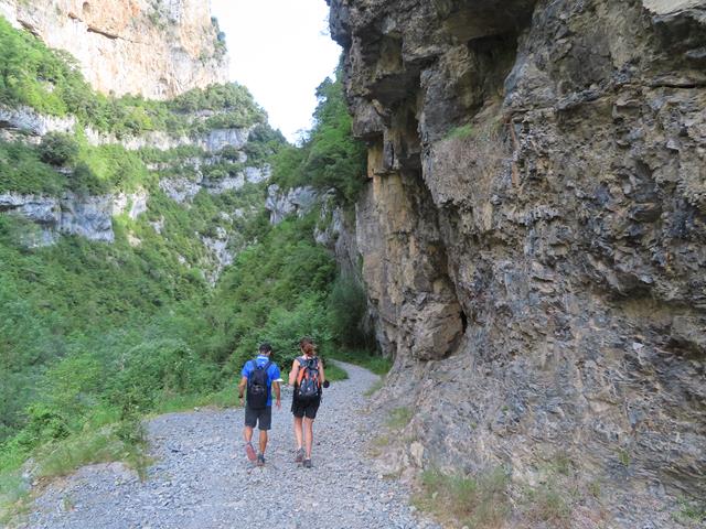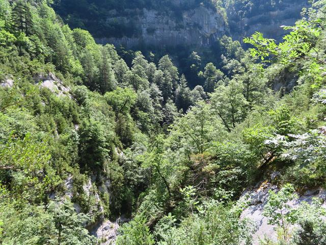 Desde aquí, mirando hacia el valle de Añisclo, ya podemos ver algunos riscos en la pared de enfrente. El perfil es en forma de V ahora, por la incisión en las calizas que ha ido haciendo el río durante miles de años, muy diferente se verá más adelante, cuando el valle vaya mostrando un perfil en U, típico de la erosión glaciar.