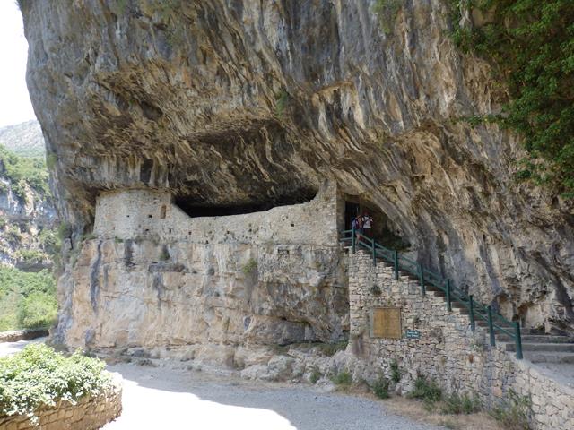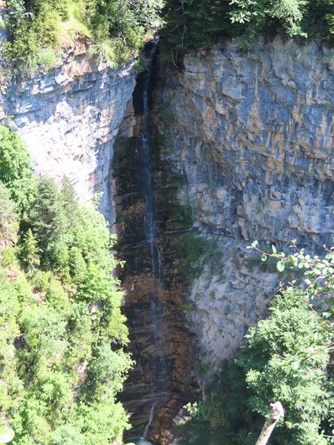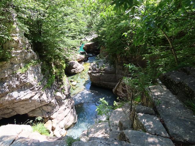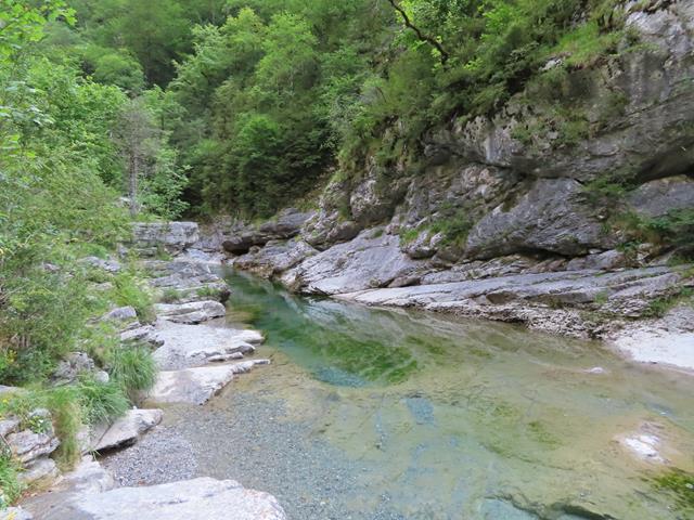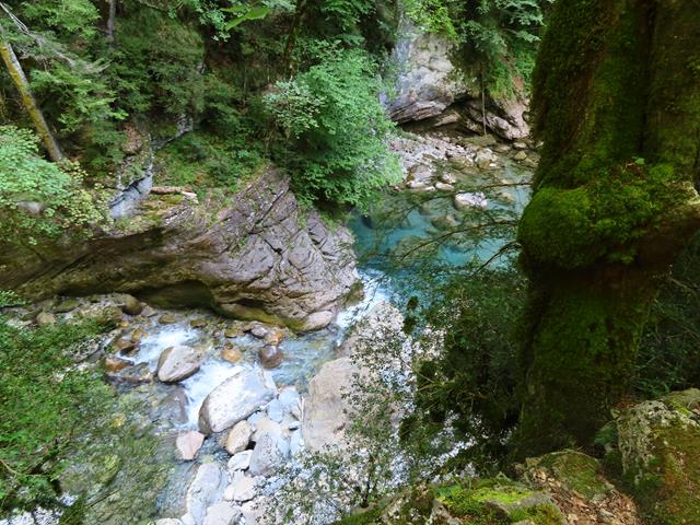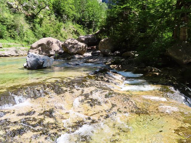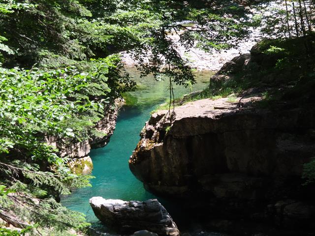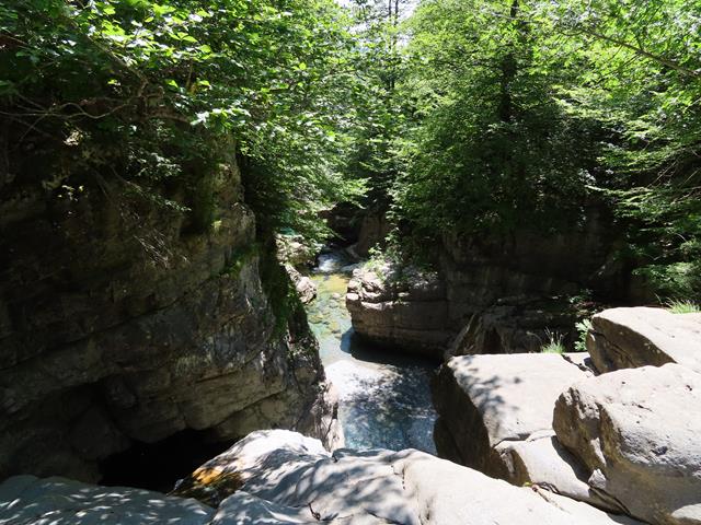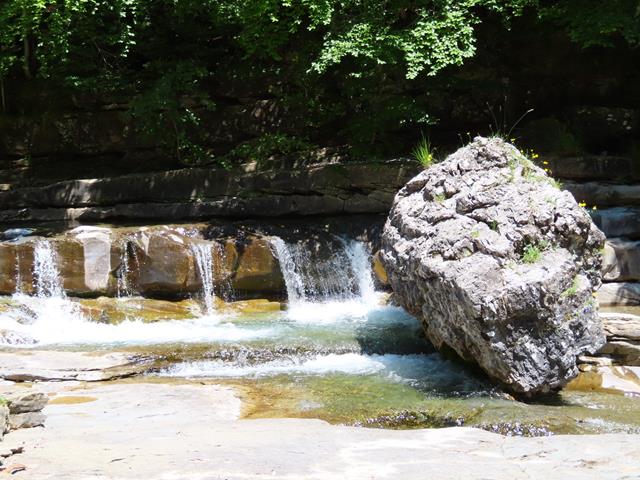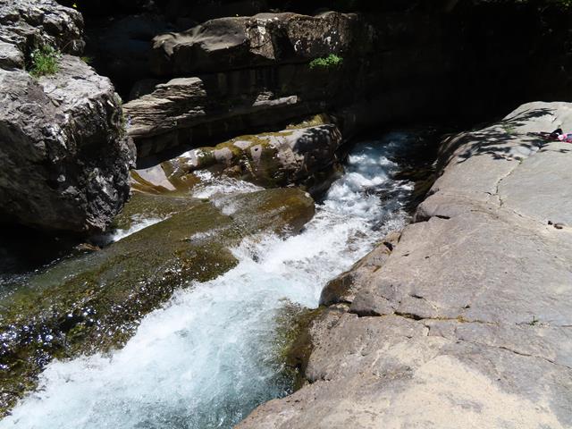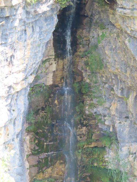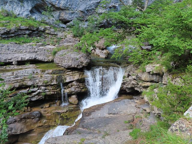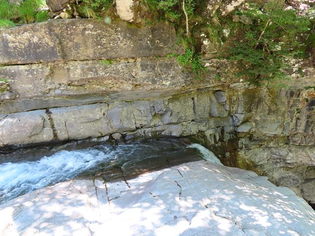 Desde aquí, mirando hacia el valle de Añisclo, ya podemos ver algunos riscos en la pared de enfrente. El perfil es en forma de V ahora, por la incisión en las calizas que ha ido haciendo el río durante miles de años, muy diferente se verá más adelante, cuando el valle vaya mostrando un perfil en U, típico de la erosión glaciar.