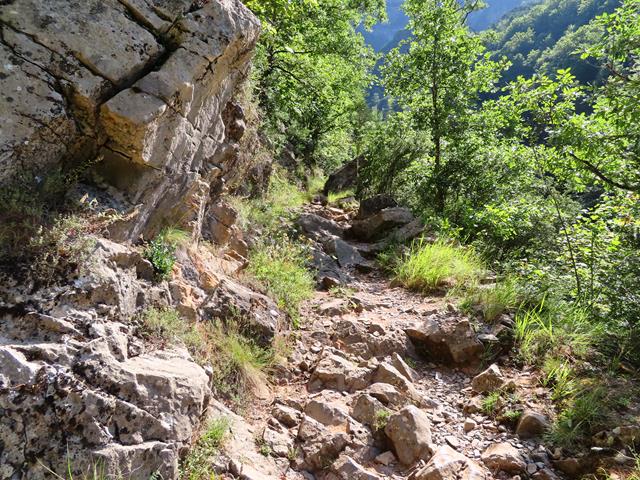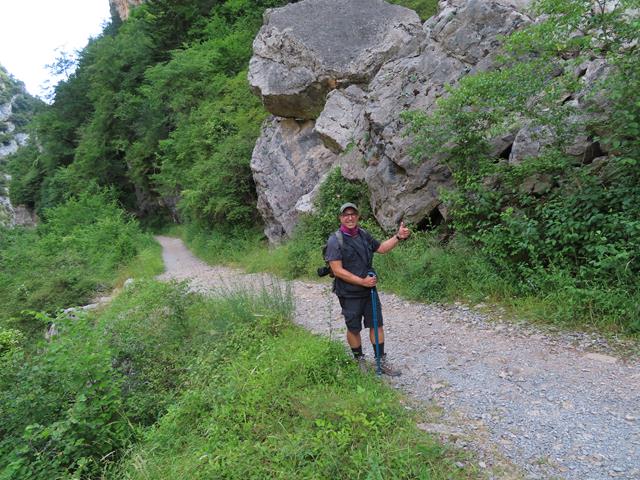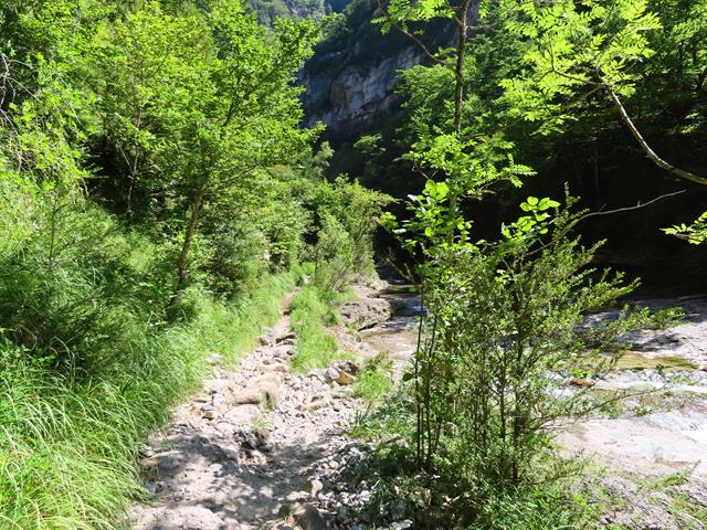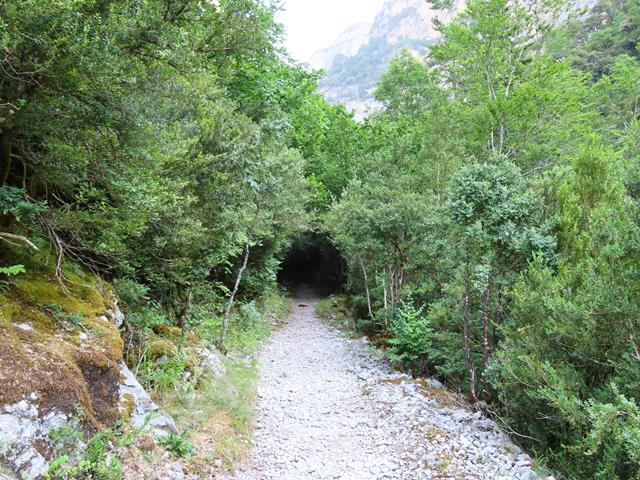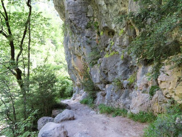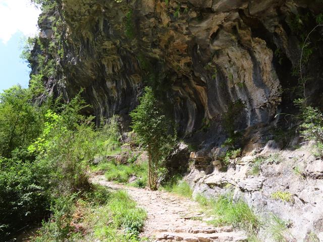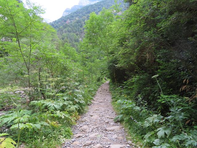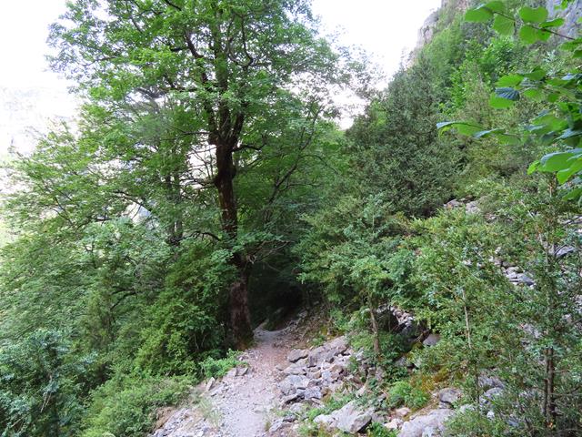 El camino continúa adentrándose en el cañón de Añisclo. Por ahora es una senda muy cómoda y fácil de recorrer. Voy continuamente con la pared de roca a mi derecha y el cauce del río a mi izquierda. De vez en cuando, aparecen las marcas del GR.15 pintadas sobre alguna piedra.
