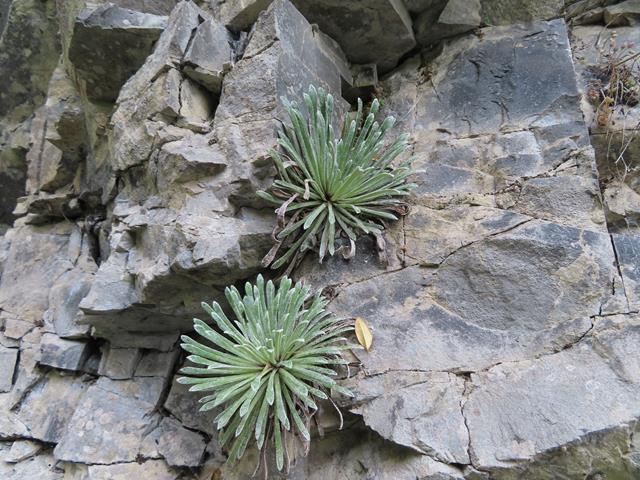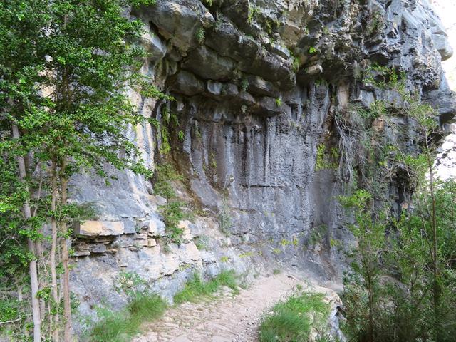 Veo sobre la roca abundantes plantas denominadas corona de rey, ó Saxifraga longifolia. Es una especie de planta fanerógama perteneciente a la familia Saxifragaceae autóctona del Pirineo y Prepirineo calcáreo, a donde llegó durante las primeras glaciaciones hace un millón de años. Observo también algunas paredes erosionadas por el río, formando salientes en la roca, e incluso algunas cuevas. La senda sigue avanzando y ahora se estrecha un poco, cada vez más.