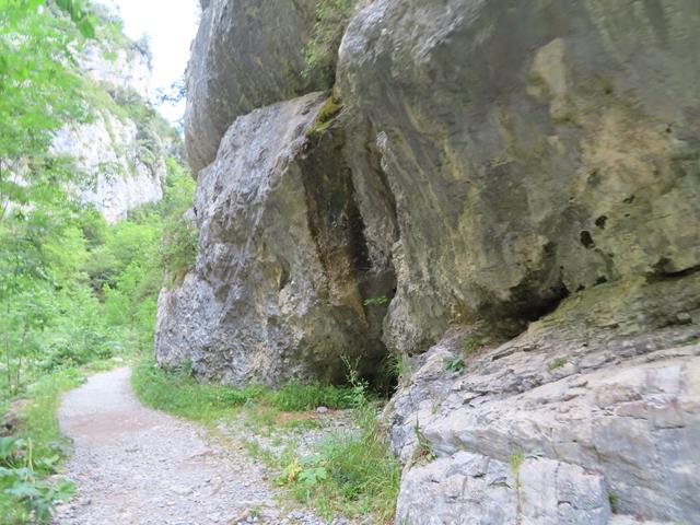 Ya voy marchando por la pista y el paisaje que tengo a mi alrededor se va transformando. Altas paredes de roca se alzan sobre mi cabeza. Hay árboles enormes que crecen en lugares inverosímiles, suspendidos sobre el abismo y bien agarrados a la pared con sus raíces. En algunas rocas se ven profundos agujeros en la superficie. Parecen cuevas enormes.