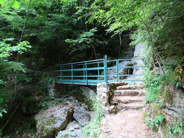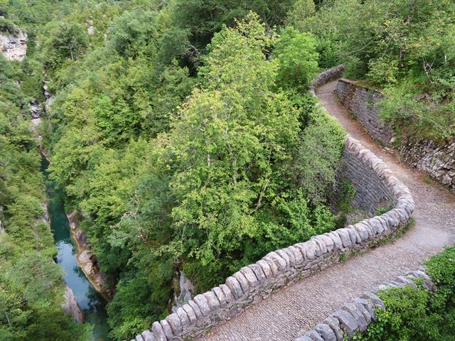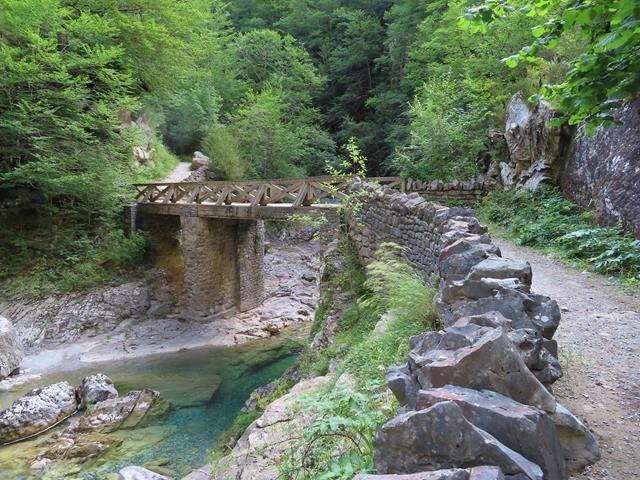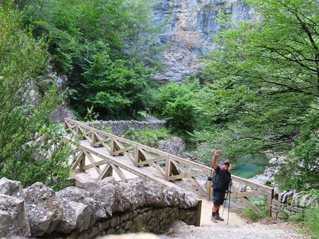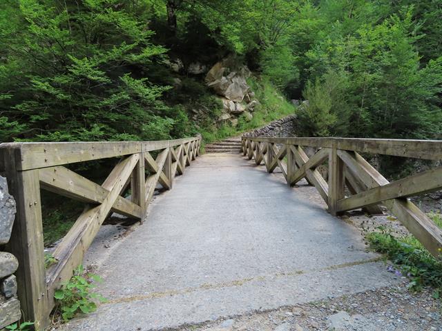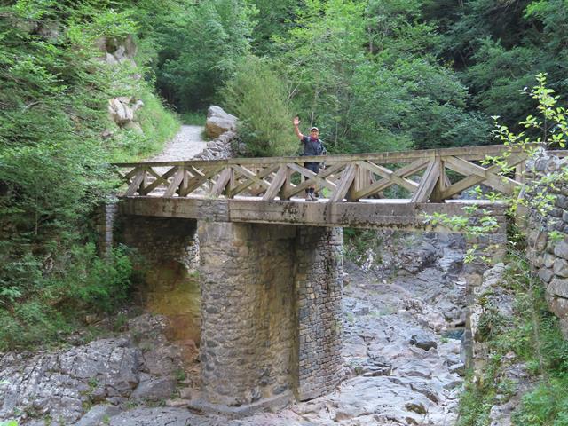 Este pequeño tramo, que discurre entre tupida vegetación y troncos llenos de musgo nos llevará directamente a una explanada junto al puente de San Úrbez. Como os decía antes, la vista desde este puente es sobrecogedora, pues está a 30 m por encima de un estrecho cortado por el que circula el agua del río Bellós. Es típico hacerse una foto sobre el puente viejo, te la tienen que sacar desde de nuevo. Yo tengo una hecha, de la otra vez que estuve por aquí.