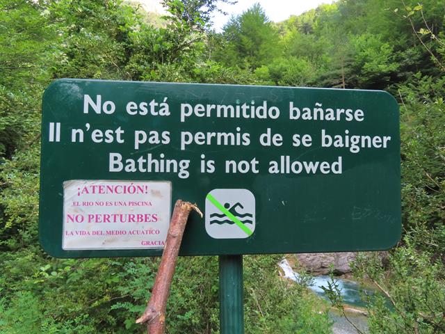 Cuando ya he cruzado el puente prosigo por una senda muy bien pavimentada y me encuentro con un cartel que indica que no se puede uno bañar en el cauce, advirtiendo de que el río no es una piscina y que no se perturbe la vida en el medio acuático.
