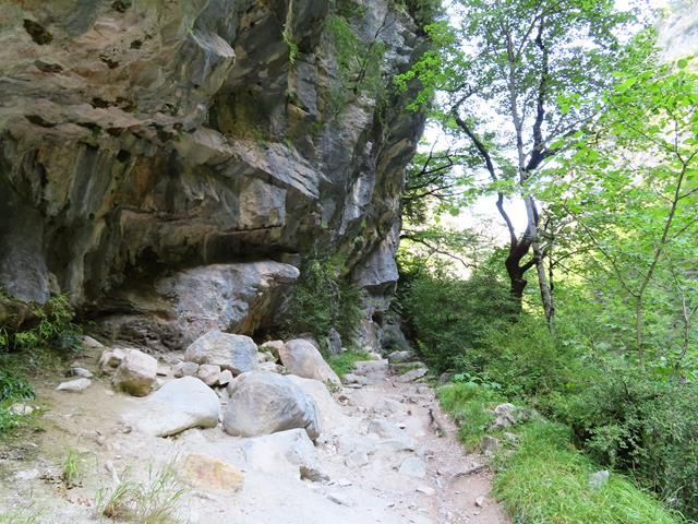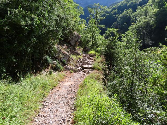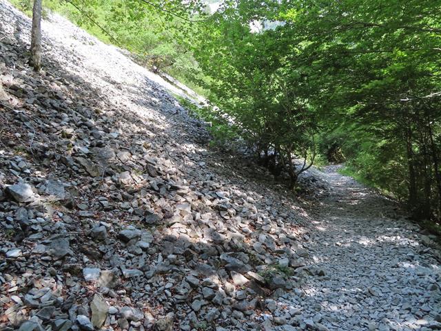 Después, el sendero se transforma en un camino de piedras de pequeño tamaño dejando a la izquierda un gran canchal o glera que se descuelga de la ladera de la montaña.