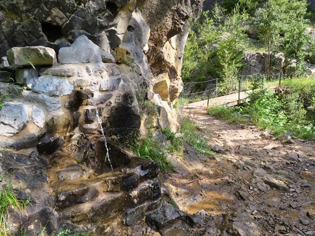 Al rato llego a otra fuente, la de la Escabiella, y a un puente metálico que hay que cruzar. Supera el pequeño barranco del mismo nombre. Hasta ahora la caminata está resultando agradable, fácil, sin mucho esfuerzo, aunque siempre subiendo paulatinamente. Aprovecho la fuente para mojarme un poco la cabeza y refrescarme la cara.