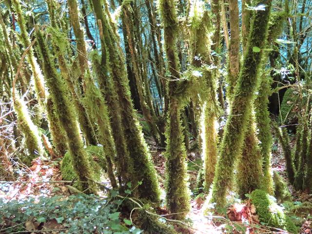 En esta zona, bastante sombría, sigue habiendo mucha humedad. Veo helechos y musgo creciendo en los troncos de los árboles, y las piedras también están recubiertas de líquenes y musgo.