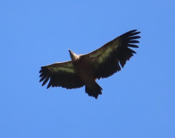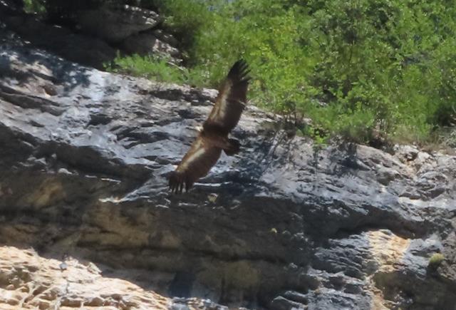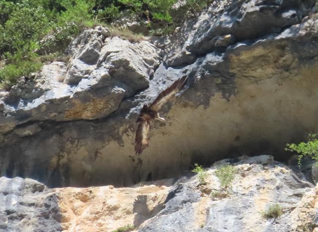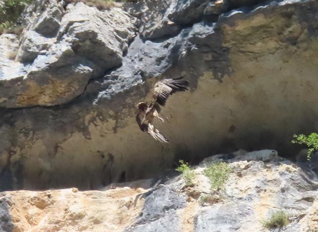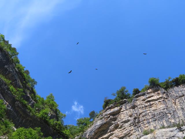 Pero no sólo hay agua en el suelo, sino mucha vida en las alturas. Varios buitres leonados otean el paraje, tal vez en busca de algún animal muerto con el que alimentarse. A ratos descansan en la roca, en unos salientes a modo de cornisas.