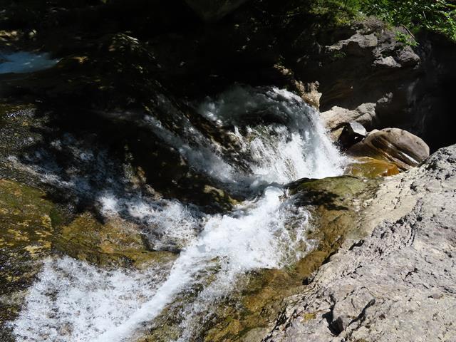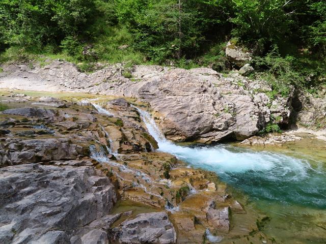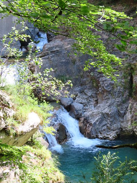 A mi izquierda, y conforme voy avanzando puedo observar las primeras cascadas que forma el río Bellós al recorrer el cauce. Veo la cascada del Cortado. A estas horas de la mañana ya se puede apreciar el azul intenso del agua. Son un deleite para la vista y para el oído, con ese rugiente sonido tan relajante.