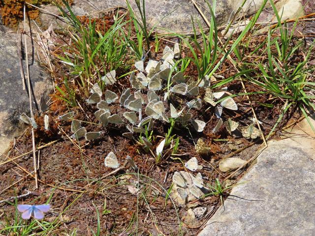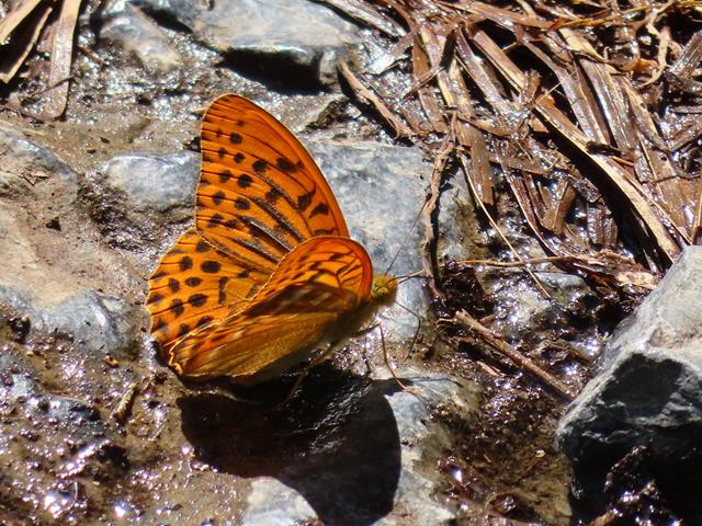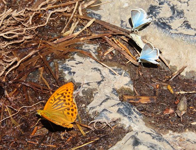 En el suelo, veo unas mariposas que están tranquilamente batiendo las alas al sol y revoloteando sin parar. Son dos especies. Una de color naranja muy vistoso y motas negras, la Plateada común o Argynnis paphia, que vive en bosques con sotobosques ricos en frambuesas y zarzas. Y también la azulada Niña turquesa ó Polyomatus dorylas, localizada en lugares herbosos, con flores y sobre terreno calcáreo.