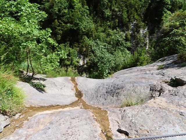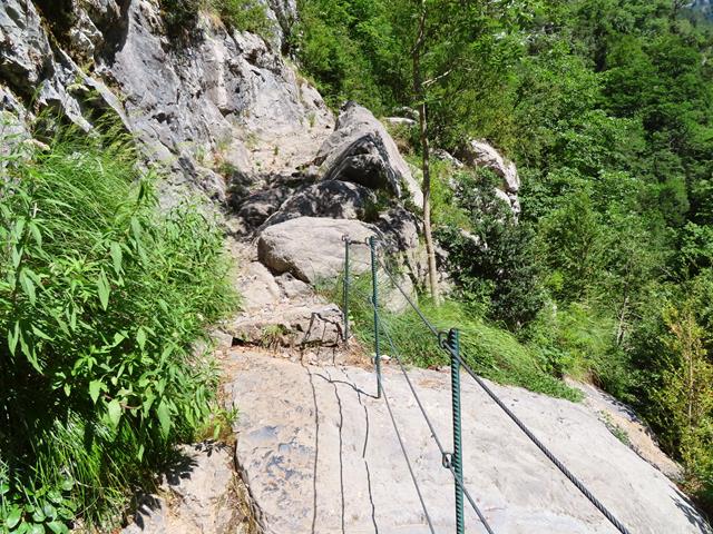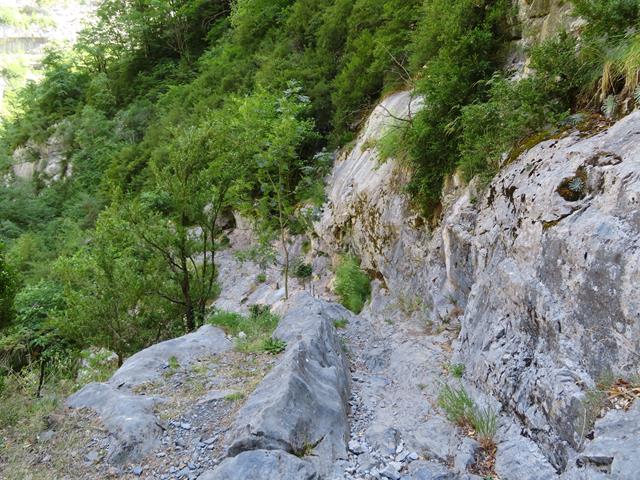 En un momento determinado la senda debe pasar por una roca que se ve pulida a conciencia por el agua. La ha limado durante años y años el torrente que en épocas de lluvia baja por el barranco Pinchau. Para evitar caídas han colocado unas sirgas metálicas y unos barrotes como los que se usan en la construcción a modo de protección.