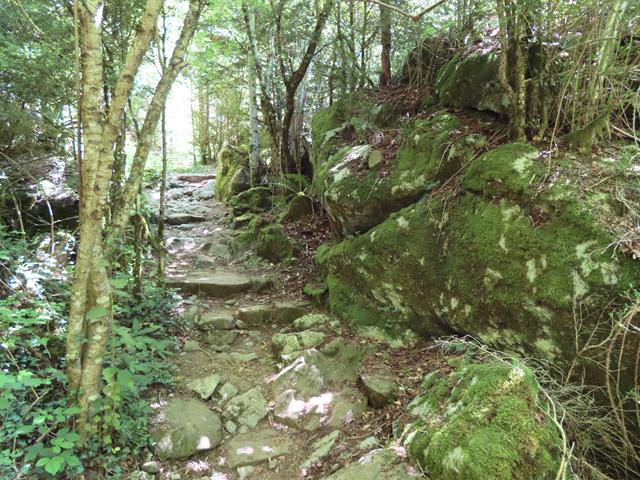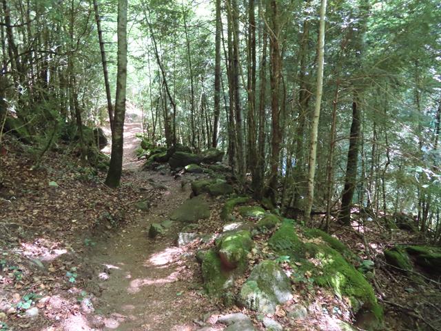 La senda sigue ascendiendo. El firme; variable. Lo común, -salvo algún pequeño trozo más cómodo tapizado de hojarasca-, son las piedras de múltiples tamaños.