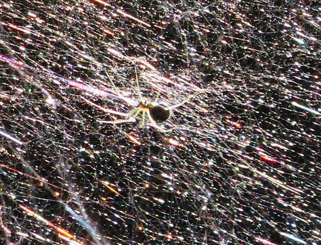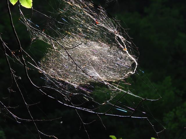 Entre las ramas de un haya veo un sinfín de hilos de tela de araña. Y en el centro, el arácnido, esperando a su presa. No puedo identificar de que tipo es a esta distancia.
