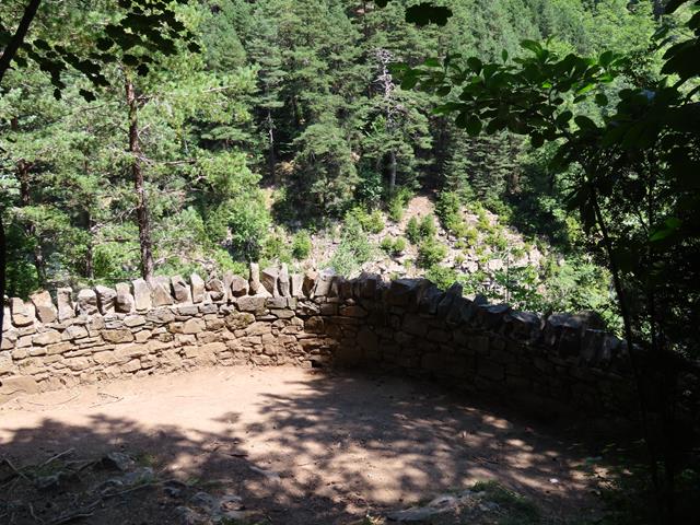 En la foto que os pongo debajo se puede ver ya la pista de San Úrbez y el murete de piedra que lo protege de posibles caídas al cañón. Tengo que estar muy cerca del puente de Sangons.
