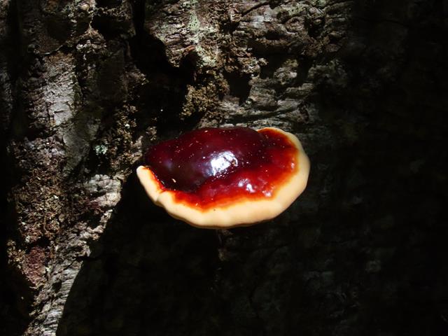 Otra vez aparecen los hongos en los troncos de los árboles. Esta vez con una apariencia muy distinta, de un rojo brillante sobre marrón claro.