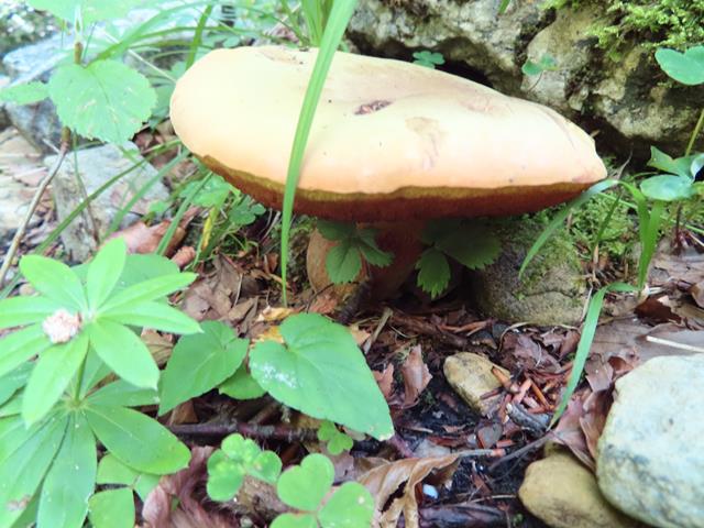 Volviendo me encuentro una seta grande, ya veis que pongo el bastón en la foto para comparar tamaños. Parece que es la Lactario húmedo -lactarius salmonicolor- vive en abetales y bosques caducifolios y puede llegar a los 15 cm. Algún animal le ha dado un par de mordiscos.