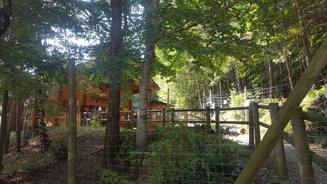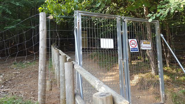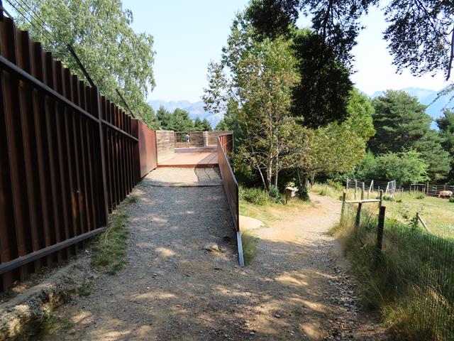 Para acceder a la zona de observación del oso hay que subir por una rampa de madera hasta una zona elevada. Todo está muy bien protegido y acondicionado. Muros de acero, alambradas, puertas metálicas. El oso es un animal fiero. El visitante no puede quedar expuesto.