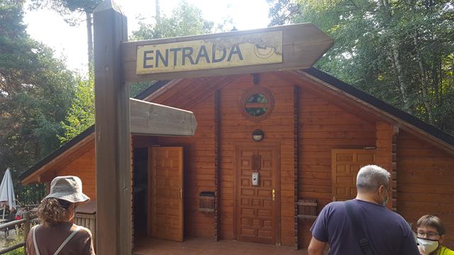 Una vez sacadas las entradas y tras atravesar por dentro la caseta de madera que pongo bajo estas líneas, accedes a una zona de descanso con unas mesas y unas sombrillas, pero es únicamente de paso. La verdadera entrada está subiendo una rampa hasta llegar cerca de una puerta y cerca metálicas.