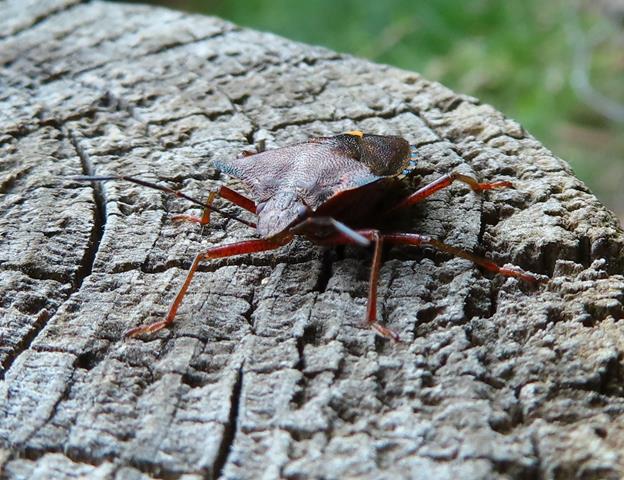 Sobre un tronco de la valla de acceso, veo un chinche amarronado. Estos insectos son inofensivos para personas y animales pero provocan daños en cultivos, huertos, árboles y plantas. Hay uno muy parecido, de una especie invasora procedente de Asia, el (Halyomorpha Halys), que se distingue de los autóctonos en que presenta en las antenas unas bandas blancas y cuando se siente amenazado, desprende un fuerte y desagradable olor como mecanismo de defensa.