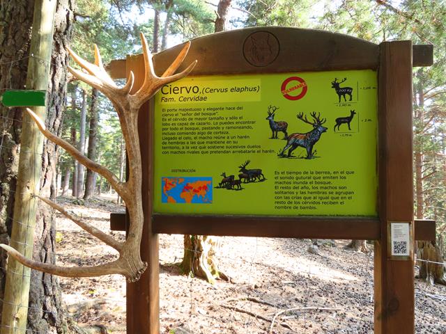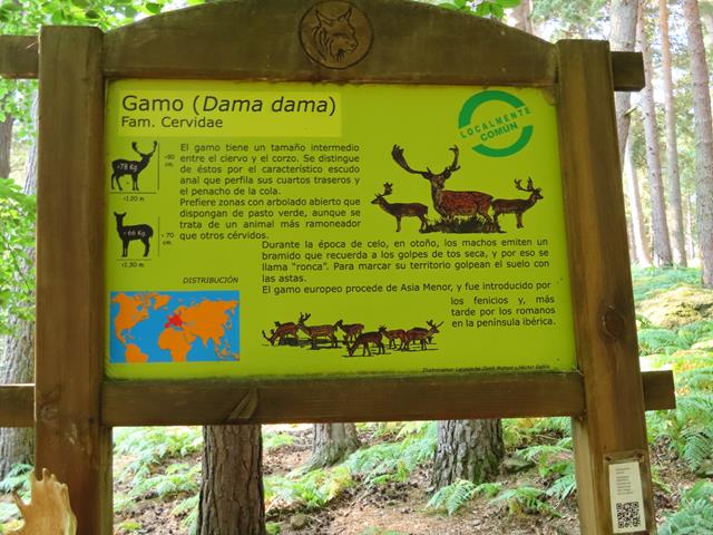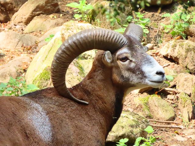 Avanzamos por las amplias sendas y llegamos a la zona del Muflón. Este animal es muy llamativo por sus potentes cuernos curvados. Vamos a ver si hay suerte y se deja ver. El muflón europeo es un animal bastante grande, el cual puede pesar hasta 50 kg (kilogramos). Se asemeja a una oveja estilizada, de patas y cuello proporcionalmente más largos. La lana es mucho más corta y de color pardo oscuro, volviéndose blanquecina en morro, ojos, mitad inferior de las patas, nalgas y vientre.