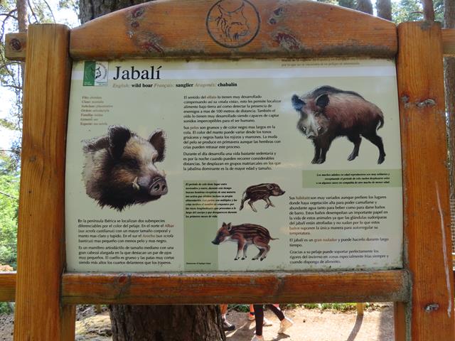 Lo siguiente que puede verse es el jabalí. Pero, no está por ninguna parte. No siempre los animales pueden observarse justo cuando pasas por allí. No están en jaulas. Están libres, así que, hasta otra ocasión. Sólo lo podemos ver el panel explicativo.