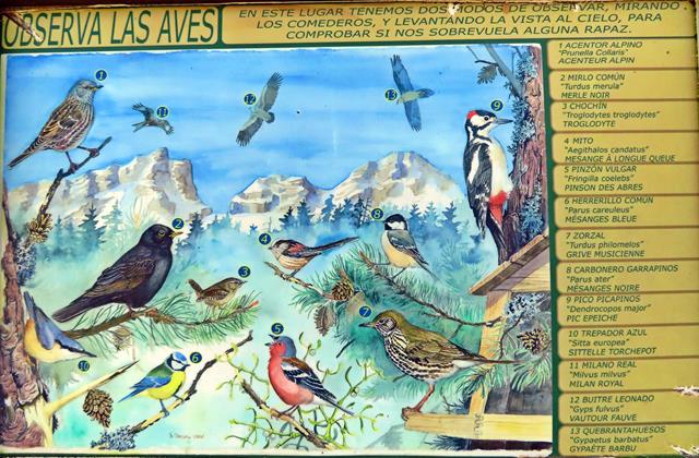 En la zona próxima a las mesas hay un bonito cartel en color explicativo de las aves que se pueden observar en el entorno. Merece la pena echarle un vistazo, y si por casualidad escuchas piar a algún pájaro, igual si miras hacia arriba, resulta que es uno de los que aparecen en el cartel.