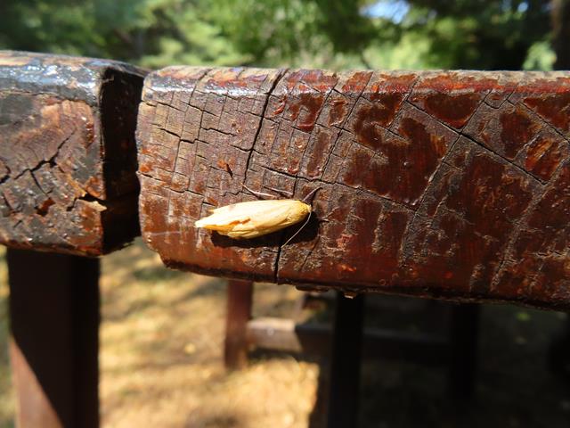 Sobre una valla de madera, veo un insecto. Es una Sitotroga cerealella, la polilla de los cereales. Es seguramente la principal plaga de los cereales, pudiendo atacar a cualquier tipo de grano, tanto en campo como en almacén tras la recolección.