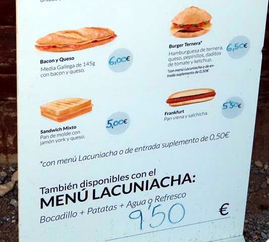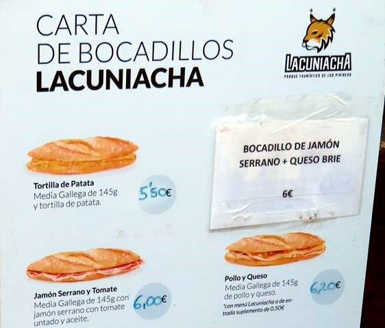 Para que lo sepáis de antemano, os pongo aquí un par de fotos de los bocadillos que se pueden comprar y de los precios, por si os es de utilidad. Nosotros no compramos ninguno, llevamos nuestros propios bocatas, comeremos al terminar la visita, seguramente en el pueblo de Panticosa. Ya veremos.
