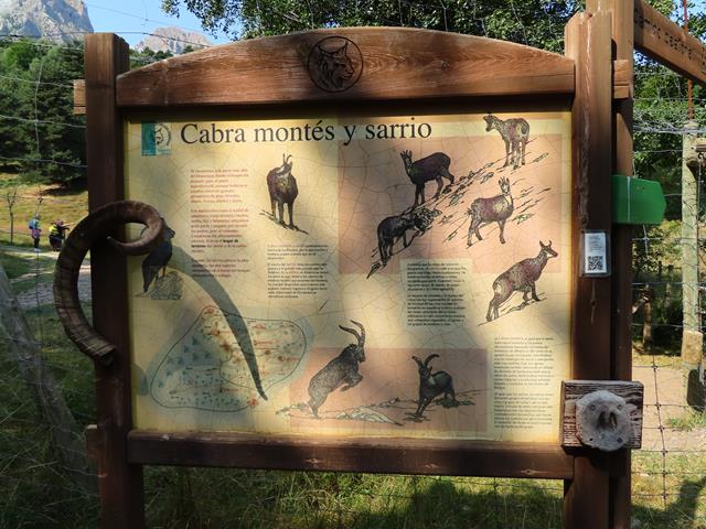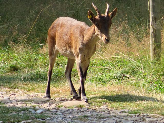 Después de quedarnos un poco chafados por no poder ver a los bisontes, continuamos recorrido y cruzamos una puerta metálica, nos toca la cabra montés y el sarrio. Esta vez sí los vemos. Una cabra va caminando libremente por la pista, sin importarle la gente. Están acostumbradas. Otras están descansando cerca plácidamente. Les hago unas cuantas fotos.