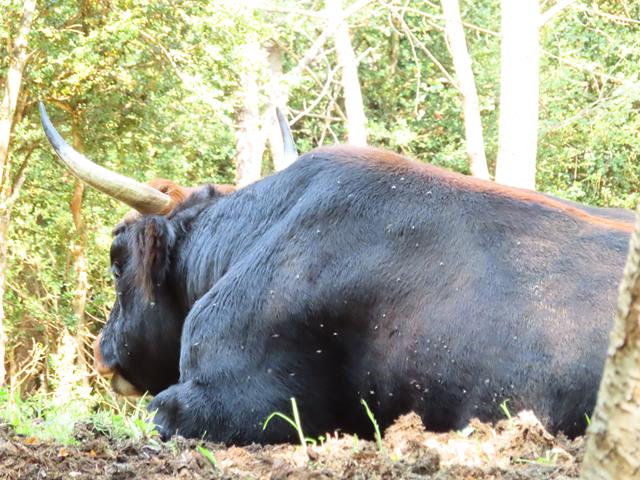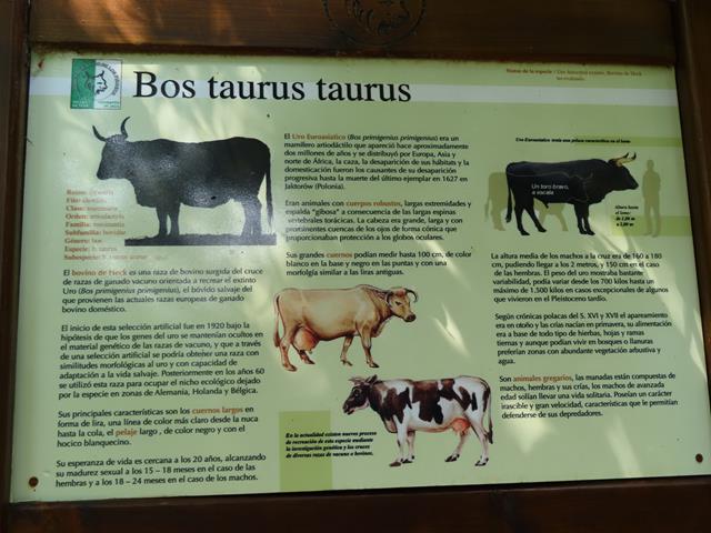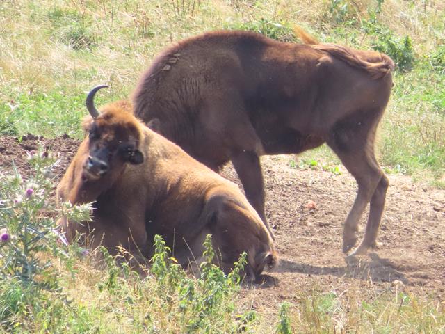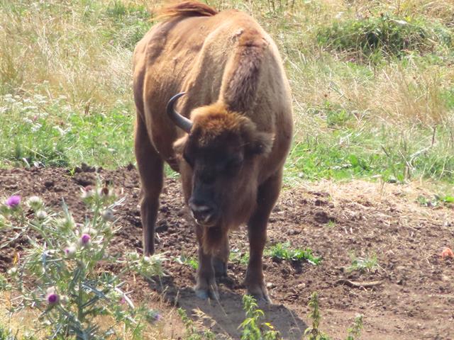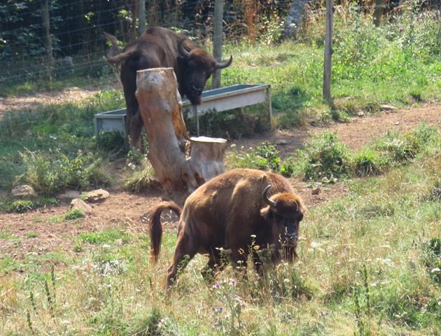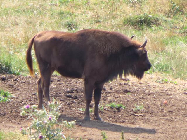 Y ahora, junto a la zona de descanso, tendríamos que poder observar uno de los platos fuertes de la visita. El Bisonte europeo .Es de aspecto similar al Bisonte americano (Bison bison), pero de constitución más ligera. Su silueta es maciza, con los cuartos delanteros muy desarrollados, la cabeza ancha y grande y la cruz marcada. El color del pelaje es pardo oscuro, largo, y particularmente desarrollado en la cabeza, hombros y cuello.