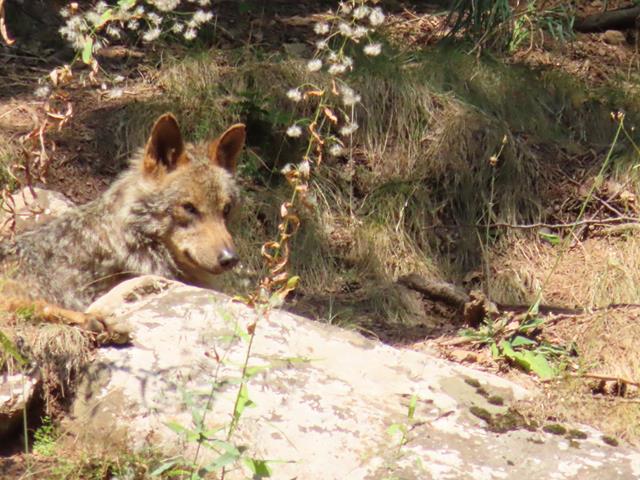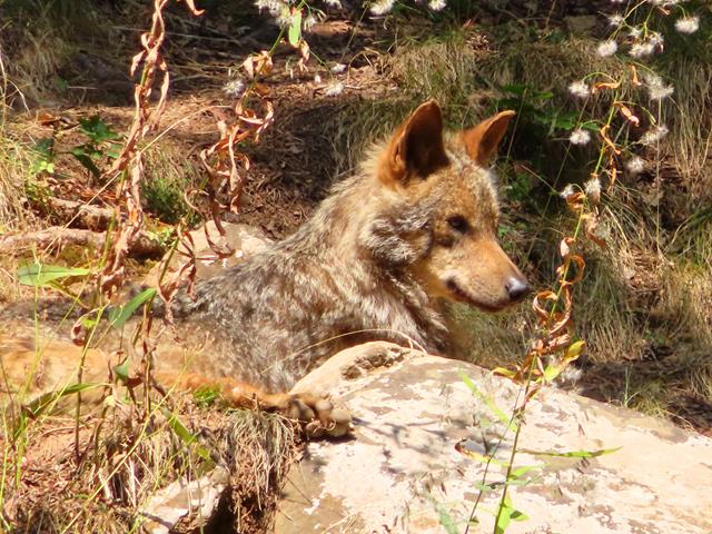 Pues bien. Al principio la decepción. Del lobo ni rastro. Vaya ¿nos iremos sin verlo?. Puede ser. Pero entonces, a lo lejos, junto a una piedra, algo se mueve…¡es el lobo!. Está echado, pero mira, y escucha atentamente. Con el zoom logro hacerle alguna foto. Es todo lo que hoy podré observar, pero bueno, al menos lo hemos visto. Os pongo un par de fotos.